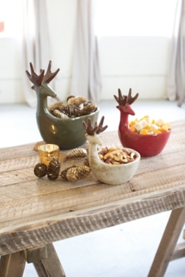 No matter if you’re dishing out homemade creations or store-bought snacks. Holidays are made for pretty presentation. Crafted of glazed ceramic, this exquisite pair of reindeer platters are game to serve.
